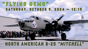 History Takes Flight: Flying Demo of the North American B-25 “Mitchell” Medium BomberAt 12:15, the Museum’s David Willis will present our Flying Demonstration with a short presentation about this amazing aircraft from the World War II-era. From its early combat introduction during the famed “Doolittle Raid” over Japan in early 1942 to its service in all theaters until war’s end, the B-25 was the workhorse of the US Army Air Force, US Navy, and US Marine Corps. David will talk briefly about the range of missions flown by B-25s and tell us the history of the Museum’s B-25J variant.