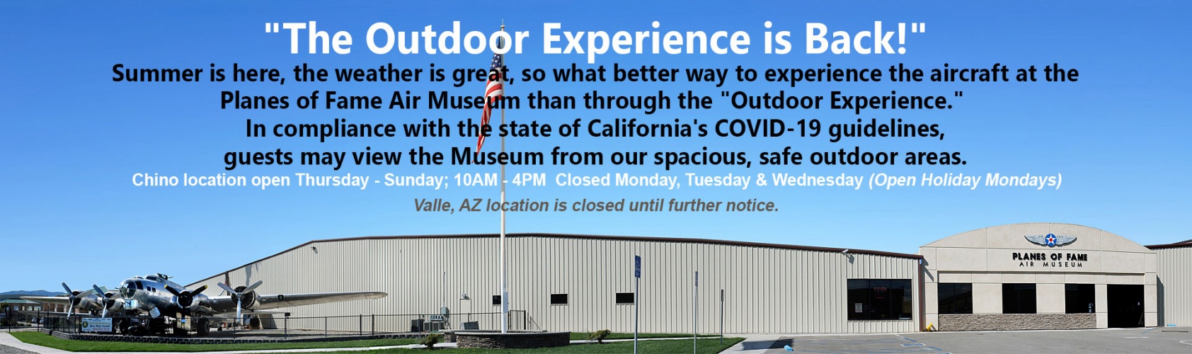 “Business As Usual" -- Planes of Fame Air Museum is open to guests Wednesdays thru Sundays. Read more ...